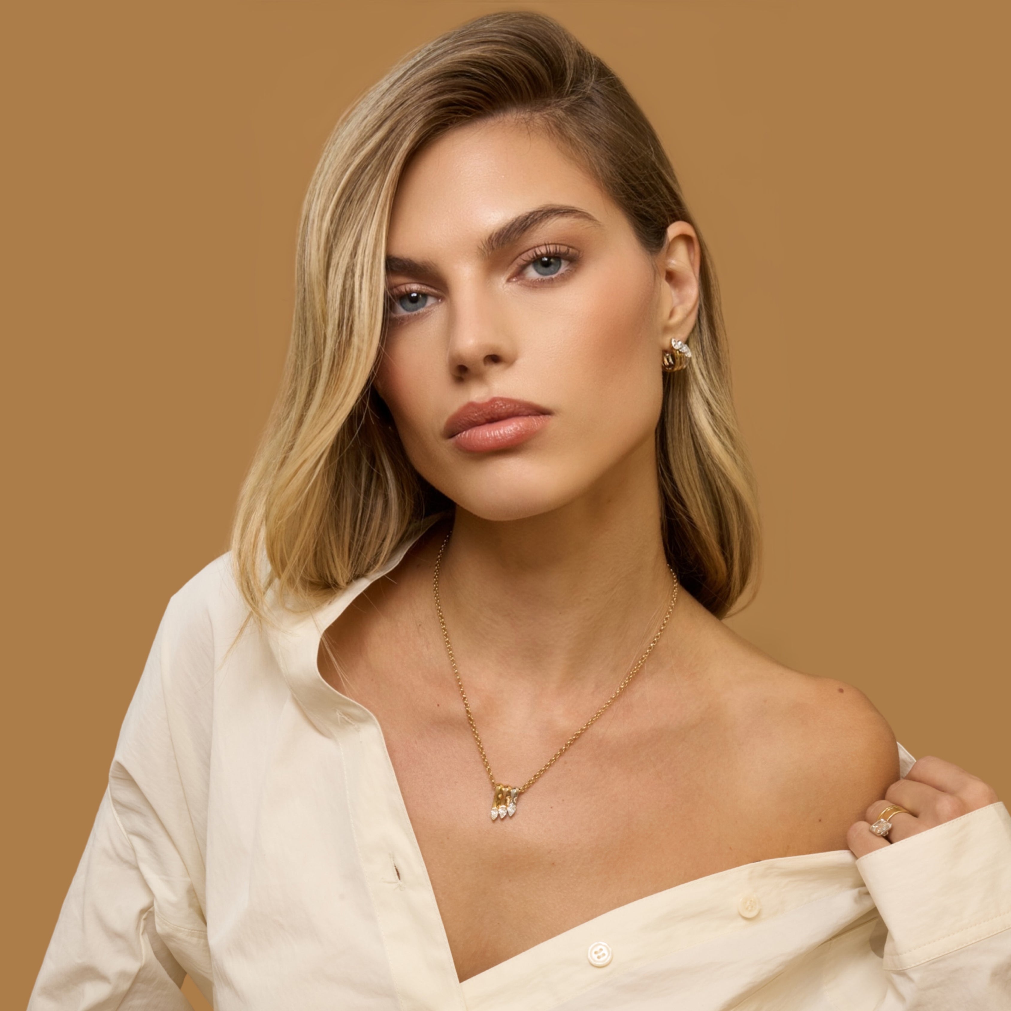 Three by Three features striking pendants that beautifully cradle clusters of three GIA-certified diamonds in 18k gold settings. Each design creates a mesmerizing trio effect—mirroring balance, unity, and refined minimalism. It’s a modern everyday essential that elevates any look with subtle brilliance.